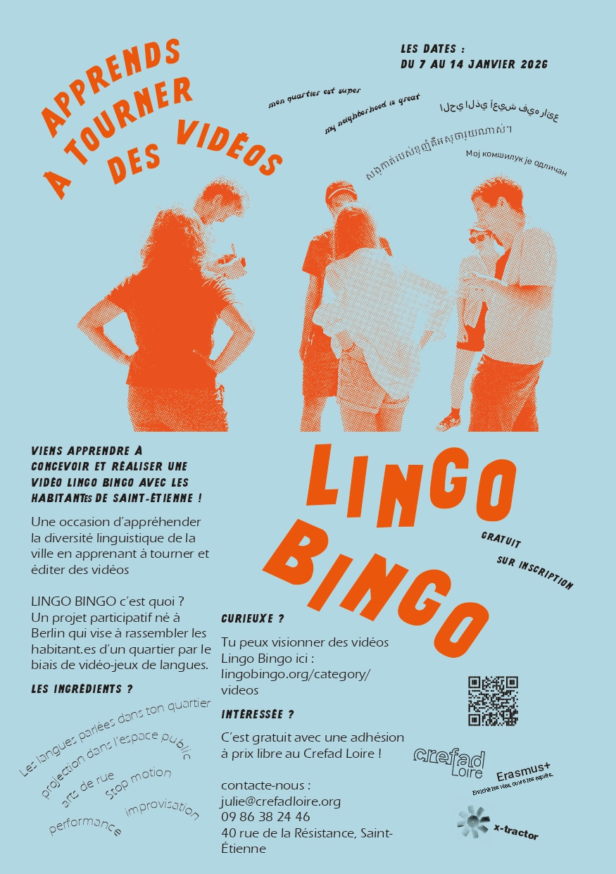 Ce début janvier, l’équipe berlinoise de l’association X-Tractor est de retour à Saint-Etienne pour le projet LINGO BINGO. L’objectif ? Former les permanent·es et bénévoles du Crefad Loire à la réalisation et au déploiement de vidéo-jeux LINGO BINGO. Avec des habitant·es de Saint-Etienne, cinq vidéos ont été réalisé dans l’intention de rendre visible les langues parlées par elles et eux. Au programme : arabe avec l’équipe de Terrain des Saveurs, khmer avec Sothea, angolais avec Paula, arpitan avec Mickaël et ukrainien avec l’association Amitié Loire Ukraine.