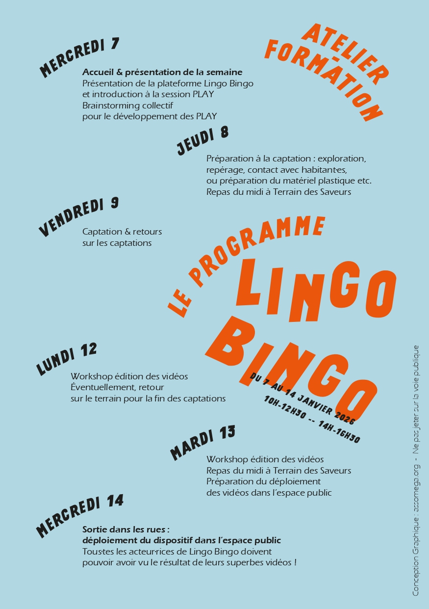 En parallèle nous élaborons la plateforme LINGO BINGO (https://lingobingo.eu) qui rassemble l’ensemble des vidéos LINGO BINGO ainsi qu’un tutoriel pour réaliser soi-même des vidéos LINGO BINGO. Vous êtes intéressé·es pour monter un projet LINGO BINGO ? N’hésitez pas à nous écrire. L’événement de clôture de ce projet aura lieu en juin 2026.